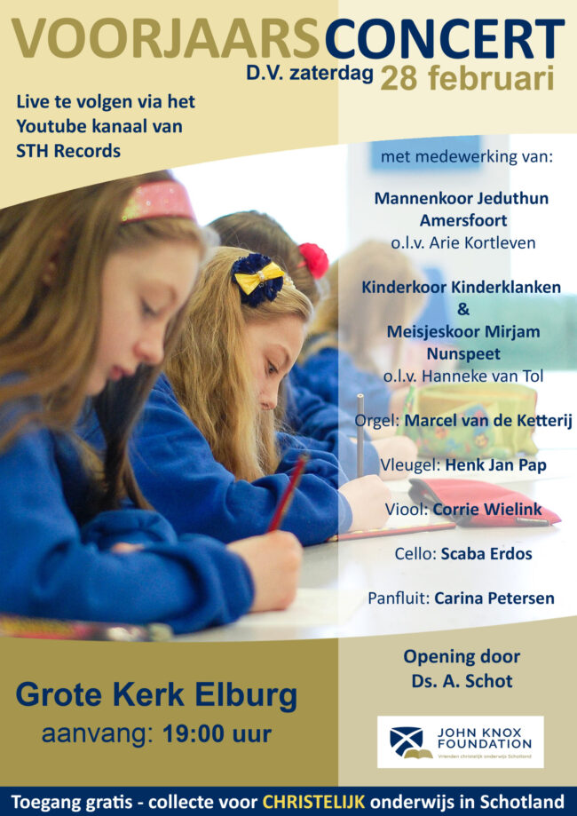 Deze zaterdag is er een concert waarbij de opbrengst bestemd is voor de John Knox foundation. Medewerking door mannenkoor Jeduthun uit Amersfoort en het kinderkoor Kinderklanken uit Nunspeet. Locatie: Grote Kerk Elburg.